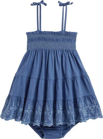 Tonal embroidery brings a pop of dimension to this ultrasweet cotton-jersey sundress featuring tie straps, a smocked bodice and matching bloomers.