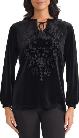 Botanical embroidery decorates the front of this easygoing split-neck top made from lightweight and stretchy velour and finished with swingy tassel ties.