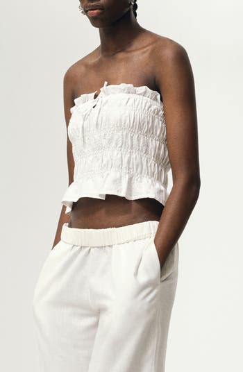 Cut from breezy cotton, this tiered strapless top is made with a dainty embroidery to further its light and lovely look.