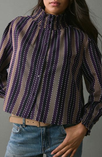 Embroidered stripes brighten this mock-neck button-up shirt cut from a soft cotton blend in a flirty cropped silhouette.