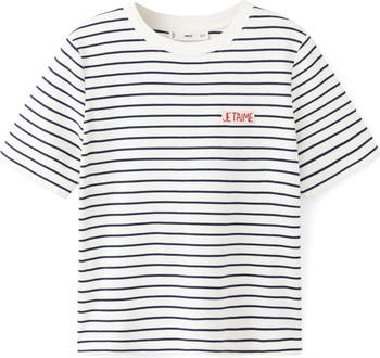 Dropped shoulders enhance the relaxed fit of this soft cotton top made with love-themed stitching and lively stripes.