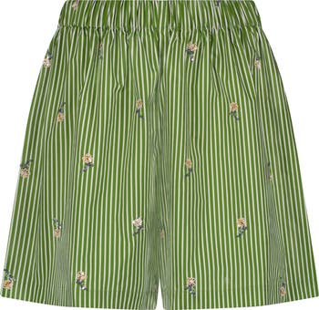 Crafted in crisp 100% cotton, these easy-wearing shorts balance tailored polish with relaxed ease. Designed with menswear-inspired striping, they are accented with hand-embroidered sequin-bead wildflower detailing for artful texture. The pull-on silhouette is meant to sit high on the waist, offering effortless refinement, and pairs seamlessly with the coordinating top or your favorite separates.