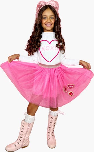 Celebrate Valentine's Day in style with this adorable two-piece outfit.Cozy white sweater features a sweet heart embroidered graphic, perfect for spreading love and joy.The pink tutu skirt adds a playful touch with heart patches and layers of tulle for extra twirl.