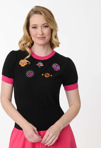 This sweater is crafted in a soft sweater knit. The bodice boasts a sweet pin-tuck diamond design that accents the embroidered with a seasonal motif. Complete with short sleeves.