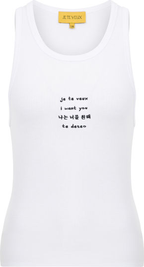 Step into style with our JE TE VEUX Embroidered Tank Top Cotton T-Shirt, featuring the brand name in three other languages with elegant embroidery on the front. Crafted from soft cotton, this stylish top offers comfort and versatility for everyday wear.