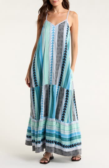 Pool blue and fresh white mix and mingle on a flowy cover-up dress cut from a cotton-rich fabric.