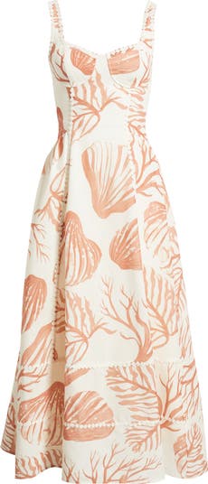 A coastal print brings beachy flair to this linen-enhanced midi dress made with seamed cups and bubbly embroidered trim.