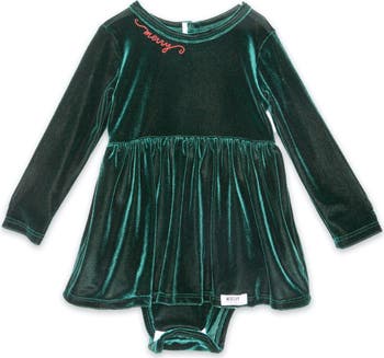 Holiday long sleeve bubble romper in stretch velvet with "Merry" embroidered at neckline. Perfect for family gatherings or pictures with Santa!