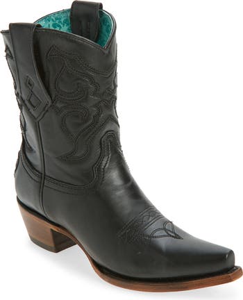 Intricate topstitching stands out on the smooth leather of a short cowboy boot designed with an upturned toe and stacked heel.