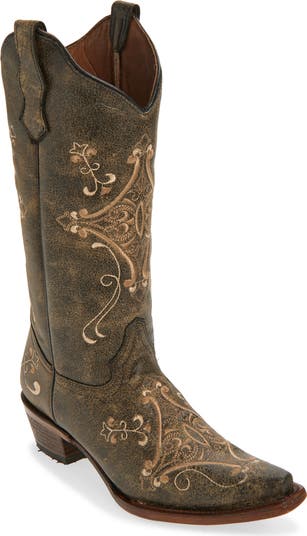 Crackled leather amplifies the vintage look of this embroidered Western boot shaped with a snip toe, dual pull tabs and a stacked heel.