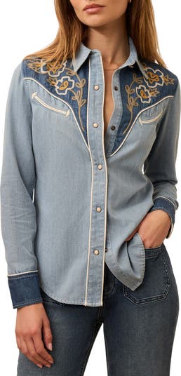Contrast piping and charming floral embroidery bring a pop of color to this lightweight denim shirt featuring easy snaps down the front and nonfunctional welt pockets at the chest.