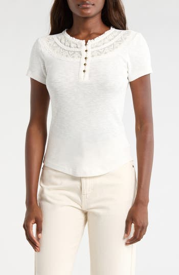 Delicate embroidery traces the yoke of this henley top finished with a half button placket and ruffle trim crew neckline.