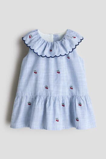 Sleeveless dress in a soft cotton weave with small, embroidered details. Round neckline featuring a wide, rounded collar with a scalloped, overlocked edge. Opening with buttons at the back and a wide frill trim at the hem. Partly lined.