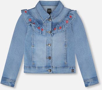 Our light blue denim jacket with embroidery is a stylish layering piece for girls. This jacket features long sleeves, a pointed collar, front button closure, and playful ruffle details at the shoulders and front, accented with delicate floral embroidery. Made from a soft cotton blend with added stretch, it combines durability and comfort with a fashionable twist.