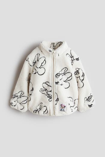 Jacket in soft teddy with embroidered motifs and elasticated binding around the edges. Stand collar, zip down the front with an anti-chafe chin guard, dropped shoulders and side pockets. Unlined.