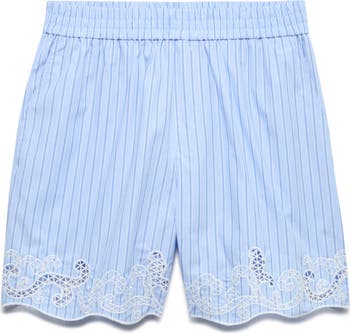 Intricate embroidery and scalloped hems add a sweet flourish to these crisply striped cotton shorts.