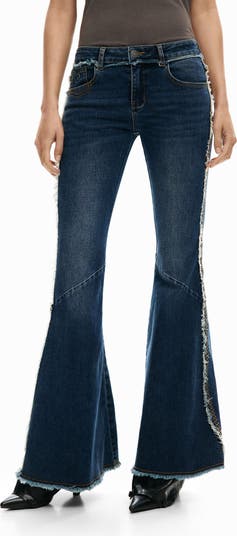 Contrast stitching and fringe trim highlight the retro-chic flared silhouette of these outfit-making dark-wash jeans.