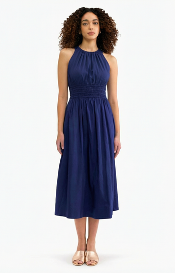 A tailored midi dress with a softly gathered high neckline and easy pull-on silhouette. Elasticated waist tunnels define the shape while keeping it comfortable, and the flowing skirt adds graceful movement. It transitions effortlessly from day to evening with a change of shoes and accessories.