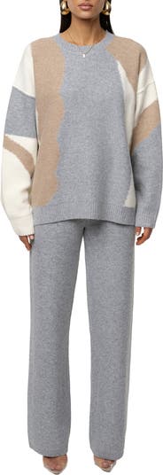 Reimagine your cozy wardrobe with artful sophistication in our Emelie Knit Pant Set. Showcasing a stunning tunic-length sweater featuring an abstract color-block pattern in soft neutral shades. Paired with matching elastic waistband pants in a relaxed straight-leg cut. Its soft knit fabric offers comfort that feels as good as it looks. Whether you're lounging at home or stepping out for a coffee run, this piece is perfect for the season. Stretchy. Sold as set.