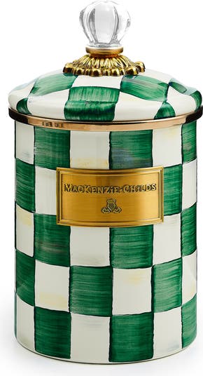 Gilt details highlight the hand-painted color-dragged checks of this enameled-steel canister you'll love displaying on a kitchen counter as it stores your pantry staples.