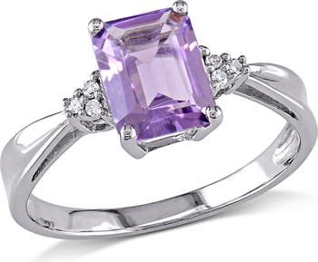 Showcase the elegant structure and rich color of this stunning amethyst and diamond ring. Crafted in radiant 10k white gold, the piece features a magnificent emerald-cut amethyst center stone, known for its deep, vibrant purple hue and sophisticated, geometric facets. The brilliance of the center gem is beautifully accented by delicate diamonds set along the shoulders of the band, adding a touch of continuous sparkle. This ring offers a perfect balance of bold color and classic brilliance, making it an exquisitely refined statement accessory.