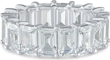 Generously sized emerald-cut cubic zirconia bring sparkly indulgence to this captivating eternity band that catches the light with every gesture.