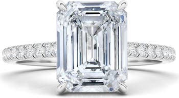 An emerald-cut lab-created diamond centers a pavé band in this 18-karat-gold ring that brightens any ensemble.