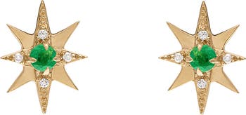 Celestial stud earrings forged in warm 14-karat gold shine with four dainty diamonds framing round emerald cabochons.