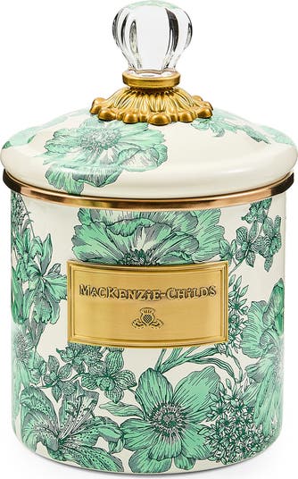 Stash your pantry staples in this small canister featuring a hand-applied, green floral pattern that gives your shelves or counters plenty of panache and personality.