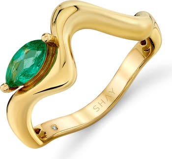 A marquise-cut emerald contributes to the sculptural design of this wavy ring crafted from high-polish 18-karat yellow gold.