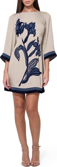Smooth darts lend a tailored look to this bell-sleeve minidress featuring an artistic floral design and contrast trim.