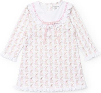 Long sleeve vintage style pima cotton dress with white woven cotton overlay, lace trim, and ribbon bow. Made from 100% Peruvian Cotton. This item is not intended for sleepwear.