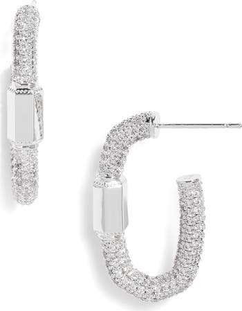 A faceted station brings high-polish contrast to these light-catching pavé hoop earrings.