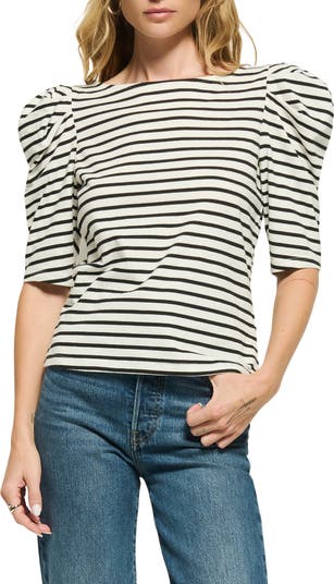 Breton stripes, once the prescribed sailor's uniform, pattern this puff-sleeve top cut from organic-cotton jersey that's soft enough to make you forget long days at sea.