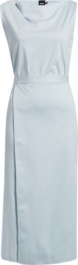A paneled skirt gives this work-to-dinner midi dress a wrap look—it's tailored from mercerized cotton to enhance its sleek silhouette, which features a subtle cowl neck and a banded waist.