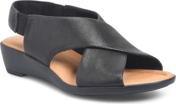 Walk all day in comfort with the cusioned Pillowtop® memory foam footbed of this versatile sandal made with soft crisscrossing leather straps and elevated on a wedge heel at a just-right height.