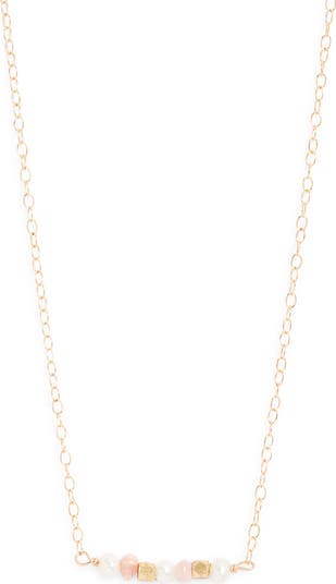 A delicate chain necklace handcrafted in Hawaii features a slim bar pendant defined by 18-karat gold-plated spacers, blush rhodochrosite and luminous pearls.