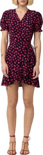 Hibiscus blossoms bring whimsical appeal to a puff-sleeve wrap dress romantically framed by a fluttery ruffled hem.