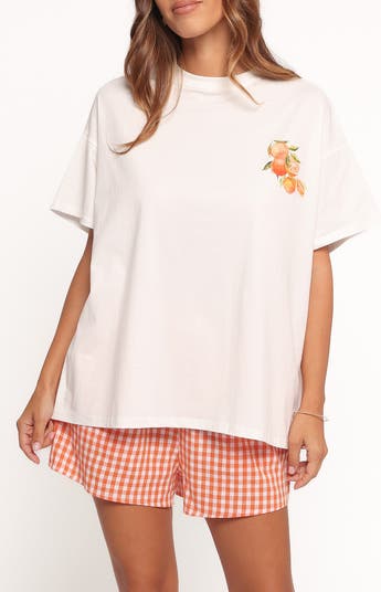 Channel carefree casual style in this oversized T-shirt featuring a citrus graphic that coordinates with elastic-waist shorts to complete the look.