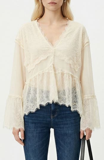 Eyelash lace trim and sheer, flowy sleeves bring romantic, vintage-touched allure to this V-neck top fashioned in a boho-inspired silhouette that moves with a graceful swing.