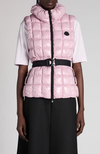 Box quilting brings a striking graphic effect to this down-filled vest made from signature lacquered nylon and equipped with an elastic belt for a waist-accentuating finish.