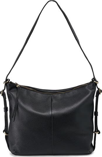 Brushed antique hardware and richly burnished leather shape a slouchy backpack designed with a roomy interior and suspended from a versatile strap that converts from shoulder to backpack wear.
