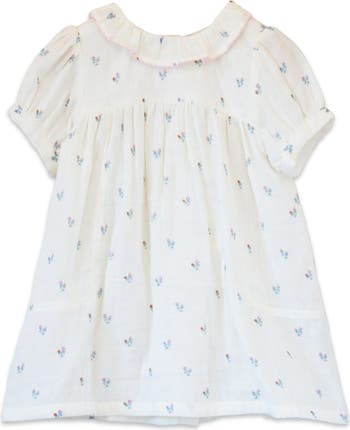 The adorable toddler dress features an empire waist, charming ruffle collar with a beautiful orange lace trim, adding dollops of cute elegance. The short puff sleeves keep it playful and stylish, while the convenient back buttons make dressing a breeze. Crafted from high-quality cotton in a stunning florals, this dress ensures comfort and durability for your child's active days. The dress has a gentle drape that looks cute with bloomers, skirts, leggings or any choice of favorite bottoms. Ages: 6 months to 4 years.