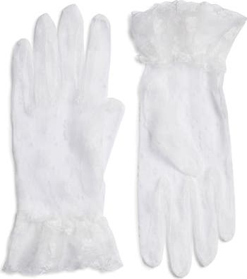 Fashioned from sheer floral lace with softly scalloped edges, these ruffle-skimmed gloves make an undeniably alluring statement.