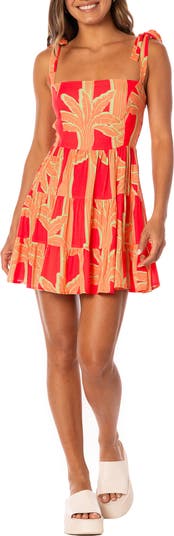 Bold and bright palm trees steal the scene on a playful minidress in a tiered fit-and-flare silhouette that's perfect for beachside parties and casual events.