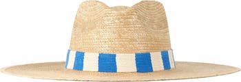 Bold stripes enliven the woven band that surrounds the crown on this classic straw hat handcrafted from palm fronds and styled with a wide, shade-providing brim.