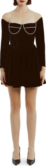 A corset-inspired bodice gives structure to this diamante-detailed minidress designed with a shoulder-baring neckline that adds to the flirty vibe.