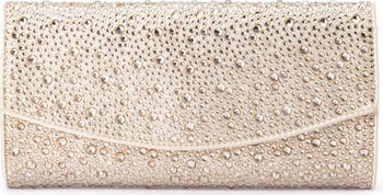 Sparkling crystals illuminate the exterior of a slim clutch suspended from an optional chain strap perfect for hands-free wear on your next evening out.
