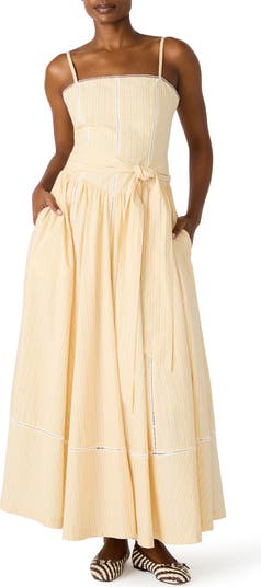 Cut from crisp poplin, this flared sleeveless maxi is accented with picot trim and ladder stitching for texture and charm.