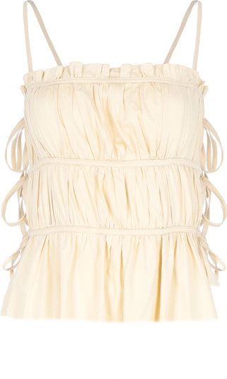Top with a ruched bodice, delicate spaghetti straps, and side tie details. Features a tiered design with a ruffled hem